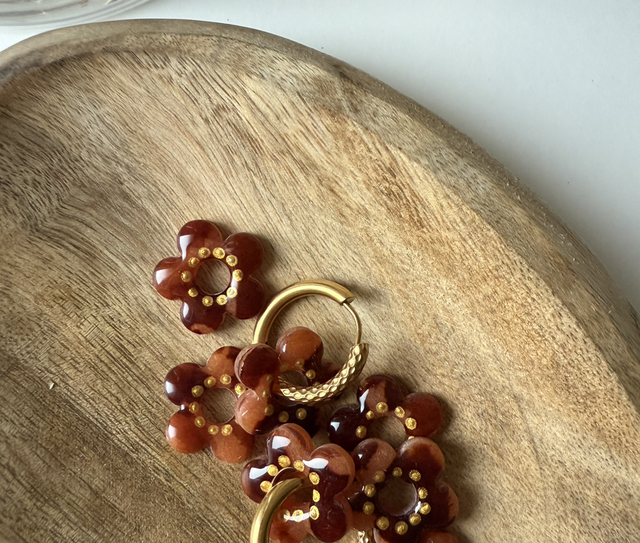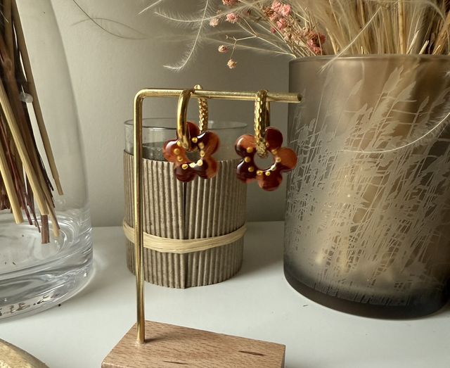 Toutes les fleurs sont faites à la main, en pâte polymère, et sont recouvertes d’une couche de résine pour plus de brillance sur la face avant des pampilles.