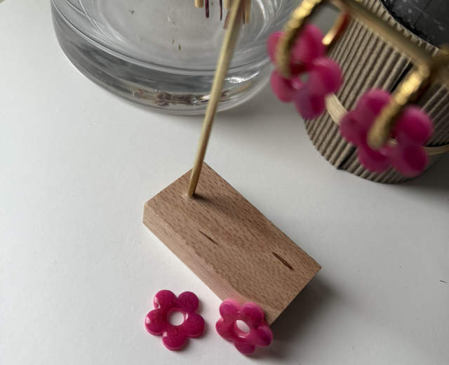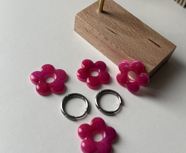 Toutes les fleurs sont faites à la main, en pâte polymère, et sont recouvertes d’une couche de résine pour plus de brillance sur la face avant des pampilles.