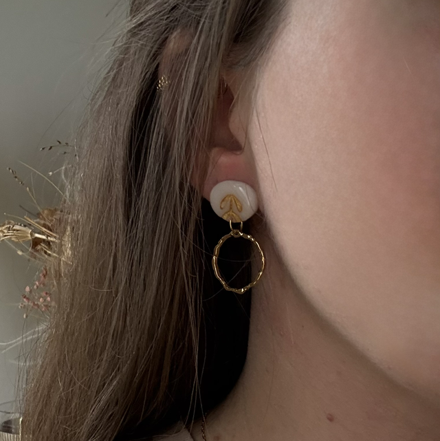 Les fleurs, ou pendentifs sont fait à la main, en pâte polymère, et sont recouverts d’une couche de résine pour plus de brillance sur leur face avant.